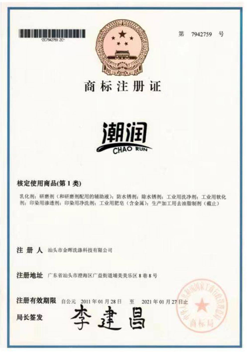 潮潤商標注冊證